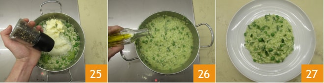 Hacia el final de la cocción añade 2/3 de la crema de guisantes 22 y lleva el arroz a su punto añadiendo caldo según sea necesario. Apaga y tapa dejando reposar un par de minutos 23. Manteca el arroz con la crema de guisantes restante, el pecorino rallado 27,