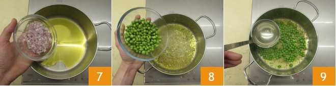 Prepara la crema de guisantes. En una cacerola calienta el aceite y añade la chalota picada 7. Ajusta de sal, añade los guisantes 8 y moja con un generoso cucharón de caldo 9. Cocina a fuego alto durante 6-7 minutos y cuando el fondo se haya secado, moja de nuevo con el caldo y cocina otros 5 minutos.