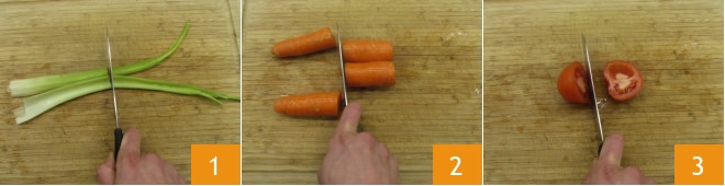 Para preparar el risotto guisantes y pecorino comienza con el Caldo de verduras. Corta por la mitad las ramas de apio 1, las zanahorias 2, el tomate 3