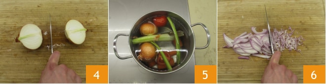 y la cebolla previamente limpia 4. Pon todos los ingredientes en una olla de bordes altos y llénala de agua, sala y deja cocinar al menos media hora 5. Ahora limpia y pica finamente las chalotas 6 y divide en dos cuencos, cada uno de 40 gramos.