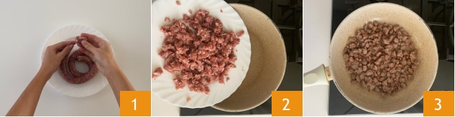 Para preparar el risotto de salchicha y espinacas, comenzad poniendo en caliente el caldo vegetal. Eliminad la tripa de la salchicha y, poco a poco, desmenuzadla 1. Luego vertedla en una sartén 2, doradla a fuego alto sin añadir otras grasas y mezclad de vez en cuando 3.