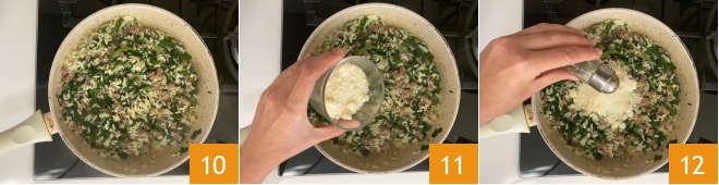 Coced unos instantes y luego apagad el fuego 10. Añadid el queso rallado 11, sal al gusto, añadid una pizca de pimienta 12,