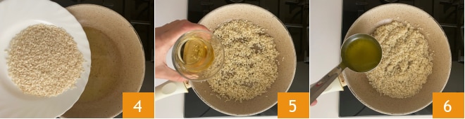 Reservad la salchicha cocida y en el mismo fondo verted un chorrito de aceite. Tostad el arroz hasta que se vuelva transparente 4. Desglasad con el vino 5 y cuando el alcohol se haya evaporado, añadid el caldo vegetal caliente: mojad de vez en cuando según sea necesario 6.