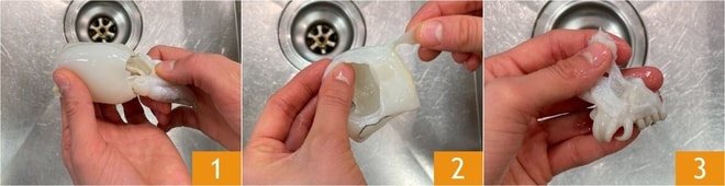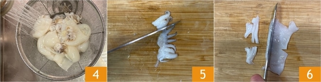 Enjuaga todo bajo agua corriente 4. En este punto, separa los tentáculos del resto de la cabeza y córtalos en trozos 5. Para el caldo, además de las aletas, conserva las partes restantes de la cabeza: en total necesitarás 400 g, si es necesario añade algunos tentáculos. En cambio, los mantos puedes cortarlos en juliana 6, para colocarlos junto con los tentáculos restantes.