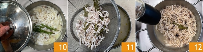 Cubre con la tapa y cocina a fuego lento durante unos 45-60 minutos, hasta que estén tiernos 10; si es necesario puedes añadir un cucharón de agua. Una vez cocidos, filtra el líquido de cocción y resérvalo 11. Vuelve a poner la sepia en la cacerola, para mantenerla caliente. Ajusta de sal y pimienta 12.