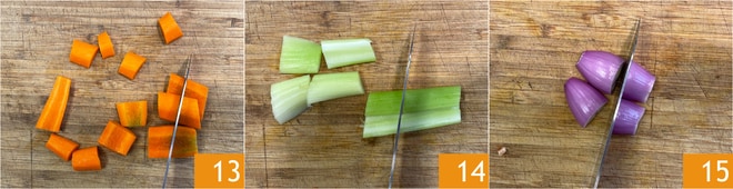 Mientras la sepia se cocina puedes preparar el caldo: limpia las zanahorias y córtalas gruesamente 13, luego haz lo mismo con el apio 14 y el chalote 15.