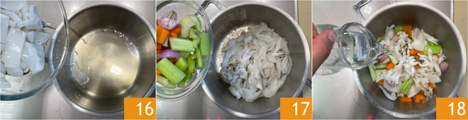 Calienta un chorro de aceite en una olla, luego añade los 400 g de sepia reservados 16 y las verduras 17. Sofríe durante 5 minutos, luego cubre con agua 18 y deja hervir a fuego lento con la tapa durante unos 20 minutos.