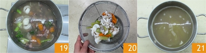 Al terminar la cocción 19, filtra el caldo obtenido 20 y agrégalo al líquido de cocción de la otra sepia, reservado 21. Mantén todo caliente.