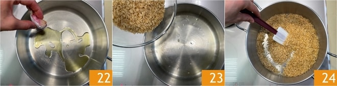 Estás listo para cocinar el risotto: en una cacerola grande deja que el aceite tome sabor con un diente de ajo machacado 22, luego retira el ajo y vierte el arroz 23. Tuesta el arroz a fuego medio-alto durante unos 5 minutos, mezclando a menudo 24.