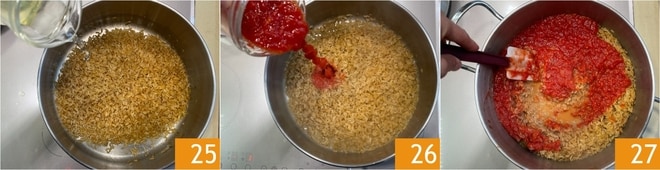 Cuando los granos estén bien calientes desglasa con 40 g de vino blanco 25, luego vierte el puré de tomate 26 y mezcla bien 27.