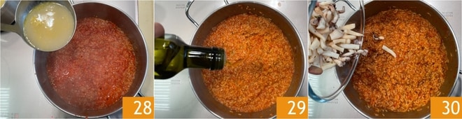 En este punto lleva a cocción el arroz añadiendo un cucharón de caldo a la vez 28; tomará unos 20 minutos. Cuando el arroz esté cocido apaga el fuego y ajusta de sal y pimienta, luego mezcla con un hilo de aceite crudo 29. Finalmente añade la sepia cocida 30.