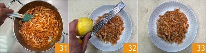 Mezcla para integrar todo 31, luego sirve adornando con ralladura de limón 32 y algunas agujas de romero. ¡Tu risotto sepia y tomate está listo para servirse 33!