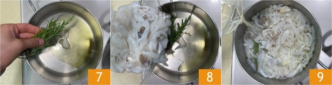 Mientras tanto en una cacerola deja que el aceite tome sabor con un diente de ajo entero y las ramitas de romero 7, luego añade los mantos cortados en juliana y los tentáculos 8. Sofríe a fuego medio durante 3 minutos antes de desglasar con 40 g de vino blanco 9.