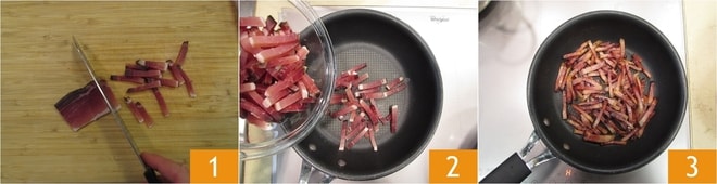 Para preparar el risotto verde con speck y berros, empezad con el speck. Cortadlo en tiras de unos 3/4 mm 1 y pasadlo a una sartén ya caliente 2; dejadlo tostar hasta que esté crujiente 3, luego apagad el fuego. Llevará unos minutos, mientras tanto, podéis empezar a preparar el risotto, mezclando el speck de vez en cuando.