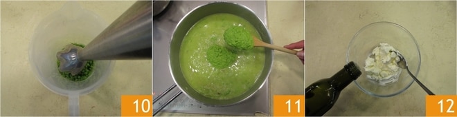 Triturad todo hasta obtener una crema lisa 10, que añadiréis a vuestro risotto a media cocción 11. Mezclad bien y llevad el risotto a cocción añadiendo más agua según sea necesario. Mientras tanto, preparad la crema de queso de cabra. Pasad el queso a un bol y añadid un chorrito de aceite 12.