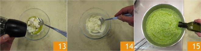 Condimentad con sal y pimienta 13 y mezclad con una cuchara hasta obtener una crema 14. Si fuera demasiado denso, añadid un poco de agua. Tan pronto como el arroz esté cocido, apagad el fuego. Mantecad con un chorrito de aceite 15.