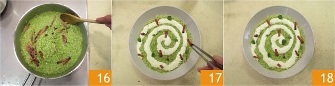 Añadid al final también parte del speck crujiente 16 y mezclad. Emplatad decorando con la crema de queso de cabra, las tiras de speck restantes y las hojitas de berros 17. ¡Servid enseguida vuestro risotto 18!