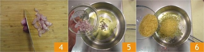 Lo primero es poner al fuego una olla llena de agua y llevarla a ebullición. Tomad el chalote y cortadlo finamente 4. Verted un chorrito de aceite de oliva virgen extra en una sartén, añadid el chalote 5 y dejadlo sofreír a fuego lento durante un par de minutos. En este punto, añadid el arroz 6, salteadlo y tostadlo a fuego vivo, hasta que los granos cambien de color.
