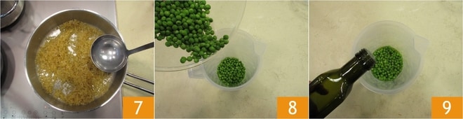 Empezad a cocinar el arroz añadiendo agua hirviendo según sea necesario, hasta cubrir el arroz y mezclando de vez en cuando. Mientras tanto, verted los guisantes crudos en un recipiente alto y estrecho 8. Añadid un chorrito de aceite 9 y una pizca de sal.