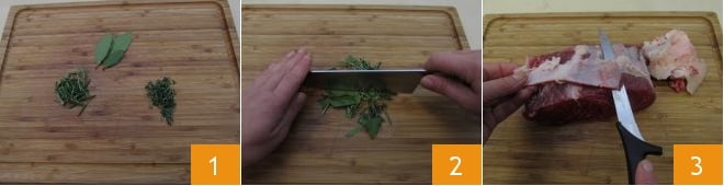 Para preparar el rosbif en costra de sal, comienza lavando y secando las hierbas aromáticas 1. Procede a picar finamente el romero, el laurel y el tomillo 2. Después corta el exceso de grasa de la carne de ternera 3. Dependiendo de la carne elegida, podrás atarla para darle una forma más compacta o dejarla tal cual si la pieza ya es lo suficientemente compacta.