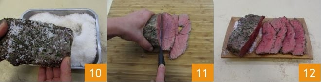 Luego toma el rosbif 10 y colócalo en una tabla de cortar, eliminando si es necesario el exceso de sal gruesa. Entonces córtalo delicadamente con un cuchillo de hoja afilada o si prefieres lonchas más finas con la cortadora 11: por dentro debe quedar rosado. Si prefieres una carne no demasiado cruda, prolonga la cocción 5 minutos, siempre en función del peso de la carne que elijas. ¡Ahora tu rosbif en costra de sal puede ser emplatado y disfrutado 12!