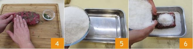 Masa la carne con el picado de hierbas aromáticas, frotándolas ligeramente por toda la superficie y asegurándote de que se adhieran bien por todos los lados 4. Ahora toma una bandeja para horno con bordes altos y más ancha que el corte de la carne en 2 cm por lado: vierte una capa de sal de aproximadamente 2 cm en el fondo 5. Coloca ahora el rosbif en la bandeja y cúbrelo uniformemente con la sal 6, creando una capa de aproximadamente 2 cm de sal por lado, una especie de envoltura. Es fundamental utilizar sal gruesa, ya que la fina se absorbería excesivamente por la carne durante la cocción.