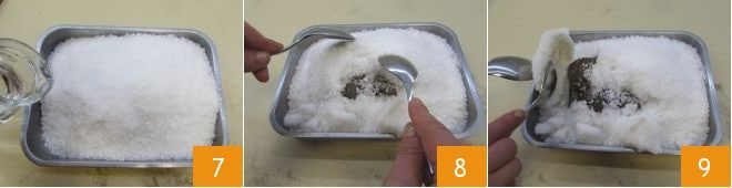 Humedece con agua la superficie de la costra de sal 7 para que esta se endurezca más durante la cocción. Finalmente, hornea en horno estático precalentado a 200°C durante 25 minutos (desaconsejamos el uso del horno ventilado ya que secaría demasiado la carne y esta al final no resultaría jugosa). No se debe abrir el horno hasta que la cocción esté completa para evitar que la temperatura baje e impida una cocción óptima. Pasado el tiempo, saca la bandeja del horno y deja reposar 10 minutos a temperatura ambiente. Luego, ayudándote de cucharas o un cuchillo si la costra se ha vuelto muy dura, quita la sal gruesa raspándola con delicadeza 8. Elimina toda la sal de cobertura poco a poco 9.