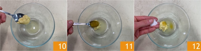 Mientras tanto, dedícate a la preparación de la salsa. En un bol, vierte el zumo de limón, la mostaza 10, la miel 11, la sal 12 y mezcla para integrar los ingredientes.