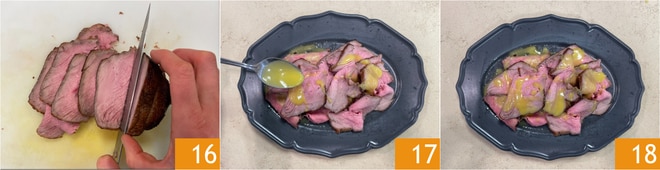 Corta el roast beef 16, emplata y cubre con la crema de mostaza y miel 17. ¡Tu roast beef en freidora de aire está listo para ser servido 18!