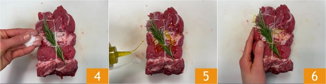 Condimenta con sal 4 y aceite 5, luego masajea la carne 6 para distribuir el condimento uniformemente sobre toda la superficie.