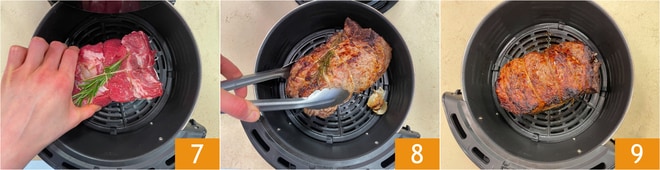 Pon la carne en el cestillo de la freidora de aire (hemos utilizado una freidora con capacidad de 6 litros) 7 y cocina a 200° durante 10 minutos, dándole la vuelta a la mitad del tiempo de cocción 8. A continuación, ajusta la temperatura a 180° y continúa la cocción durante otros 20-30 minutos 9, girando frecuentemente la carne para que no se queme. La carne estará cocida cuando alcance una temperatura interna de 48-50°C. Deja que se temple.