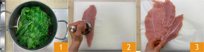 Para preparar el rollé de pavo, lo primero es preparar el Caldo de verduras siguiendo nuestra receta. Escalda las espinacas en el caldo 1, luego déjalas escurrir para eliminar el exceso de líquido y sazona ligeramente; conserva el caldo porque lo necesitarás para la cocción al horno del rollo. Extiende una hoja de papel de horno sobre la superficie de trabajo, golpea las lonchas de pechuga de pavo 2 y superponlas ligeramente para formar un rectángulo 3.