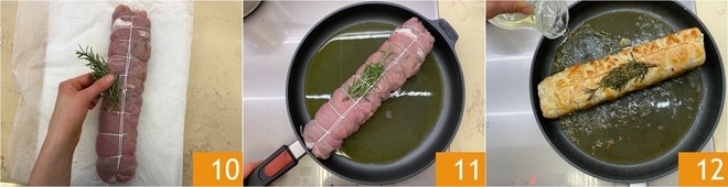 Inserta una ramita de romero en el hilo 10 y sala la superficie. Ahora calienta un poco de aceite en una sartén grande y dora el rollo a fuego alto por todos los lados 11, luego vierte el vino 12 y deja que se evapore completamente.