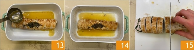 Traslada el rollé a una bandeja de horno, añade el caldo 13 y cuece en horno estático precalentado a 200° durante 30 minutos 14. Transcurrido el tiempo de cocción, corta el rollo en rebanadas 15.