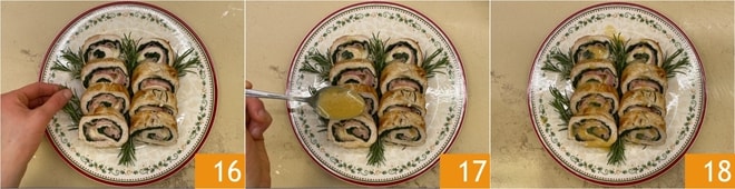 Emplata adornando con las ramitas de romero 16 y rociando la carne con el fondo de cocción que se habrá reducido 17. ¡Tu rollé de pavo está listo para ser servido 18!