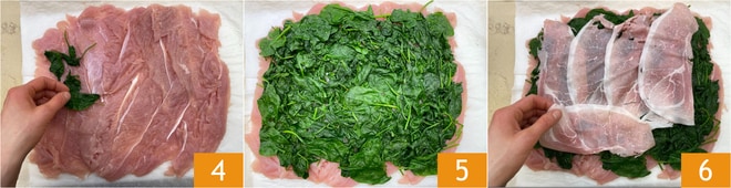 Distribuye las espinacas bien escurridas 4 hasta cubrir completamente las lonchas de carne 5, luego coloca las lonchas de jamón cocido 6.