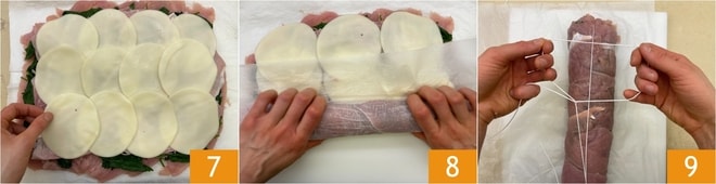 Finalmente, añade las lonchas de provola 7. Enrolla todo desde el lado más largo ayudándote con el papel de horno 8, debes obtener un rollo apretado y compacto. En este punto, sella el rollo obtenido con hilo: primero átalo a lo largo, luego forma lazadas a un par de dedos de distancia una de otra 9.