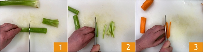 Para preparar los rollitos a la romana, antes que nada cortad el apio y cortadlo primero en trozos 1 y luego en tiras finas 2. Pasad a la zanahoria: tras pelarla, obtened bastoncitos finos 3