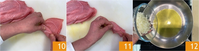 Enrollad la loncha sellando el relleno en su interior para formar unos rollitos bien apretados 10. Sujetadlos con un palillo para que mantengan la forma durante la cocción 11. Calentad el aceite en una cazuela, luego añadid la cebolla picada 12 y dejad sofreír a fuego medio-bajo durante unos 7-8 minutos hasta que esté blanda y transparente.