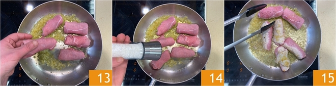 En este punto colocad los rollitos en la cazuela 13, pimientad y salad 14, y luego doradlos durante unos minutos, dándoles la vuelta con unas pinzas para que se doren uniformemente por todos los lados 15