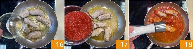 Cuando estén bien dorados, añadid el vino blanco 16 y dejad evaporar completamente la parte alcohólica. Añadid entonces la pulpa de tomate 17, mezclad suavemente para distribuir el condimento y corregid de sal 18.
