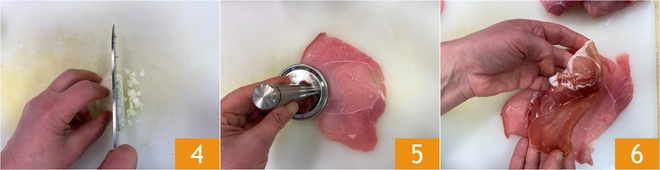 Pelad la cebolla y picadla finamente con el cuchillo 4. A continuación, ocupaos de la carne: colocad las lonchas de ternera sobre una tabla y, si es necesario, golpeadlas ligeramente con el ablandador para dejarlas más finas y uniformes 5. Sobre cada loncha colocad entonces una loncha de jamón crudo 6