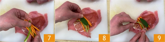 Distribuid en el centro algunos bastoncitos de zanahoria y apio 7 y completad con una hoja de salvia 8. Cerrad la carne plegando los bordes hacia el interior 9