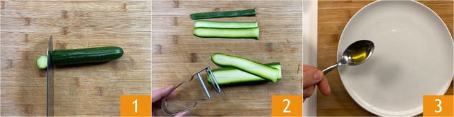 Para preparar los rollitos de calabacín, como primer paso, quita los extremos de los calabacines 1. Luego, corta rodajas muy finas con un pelador de verduras, cortando en la dirección de la longitud 2. Pon el aceite y el pan rallado rústico en dos platos 3.