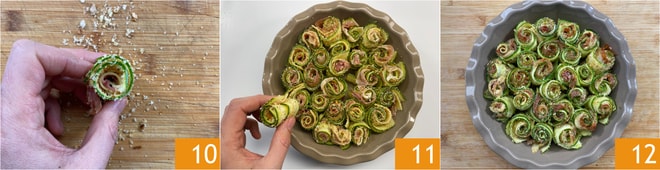 Una vez hechos todos los rollos 10, colócalos en una bandeja de manera que se sostengan entre sí 11. Hornea en un horno estático a 200°C durante 15 minutos. Tus rollitos de calabacín están listos para ser servidos 12