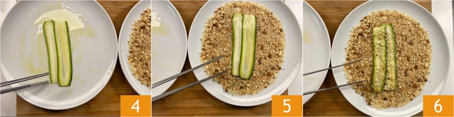 Une dos rodajas de calabacín y pásalas primero por el aceite 4 y luego por el pan rallado por ambos lados 5 6.