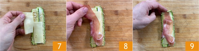 Rellénalas con fontina 7 y jamón curado 8. Enrolla suavemente para no perder el rebozado 9.