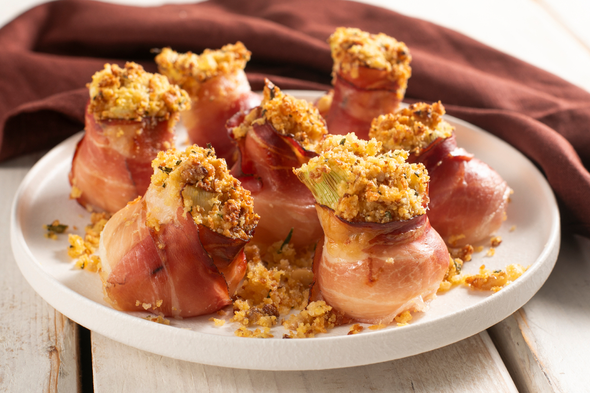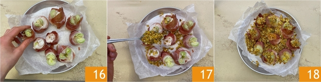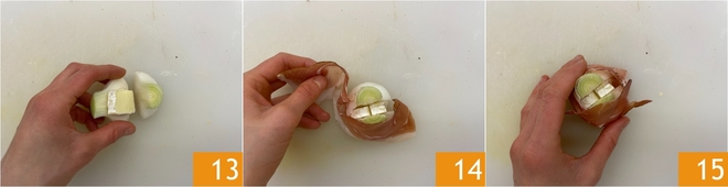 Rellenad las cebolletas colocando un trocito de brie en el centro de una de las mitades 13, luego cerrad con la otra mitad para envolver el queso. Envolved cada cebolleta rellena con una loncha de speck 14, presionando para que se adhiera bien 15.