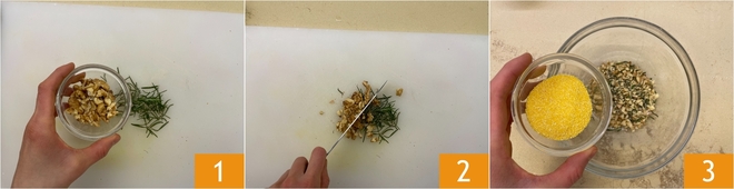 Para preparar los rollitos de cebolletas, empezad por el empanado: colocad sobre una tabla las nueces junto con el romero 1 y picadlas finamente 2. Verted en un bol la mezcla recién picada y la harina de maíz 3.