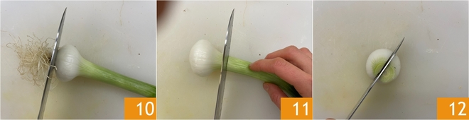 Lavad las cebolletas eliminando la parte exterior más dura, recortad los dos extremos 10 11 y divididlas por la mitad a lo largo 12.